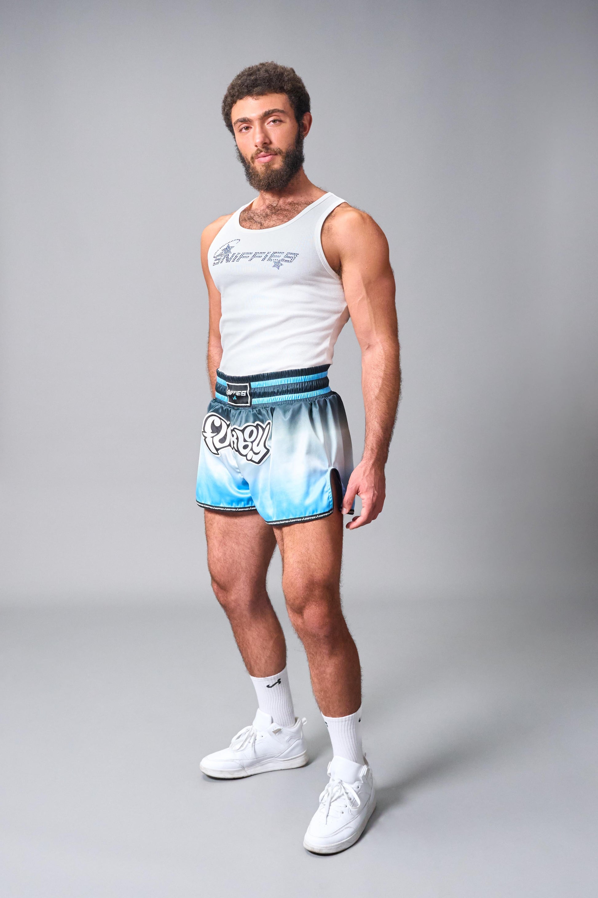 Inspired by Thai boxing shorts, the Sniffies F*ckboy Short was designed with all your Summer needs in mind. Get rough (or roughed up) in these gradient upper-thigh shorts emblazoned with a champion Cruiser f#ckboy patch and side vents to let you show some extra leg in the summer heat. We added a zipper back pocket to keep your essentials safe, logo patches, and a drawcord to make this your new favorite short. Ding ding ding, we have a winner!