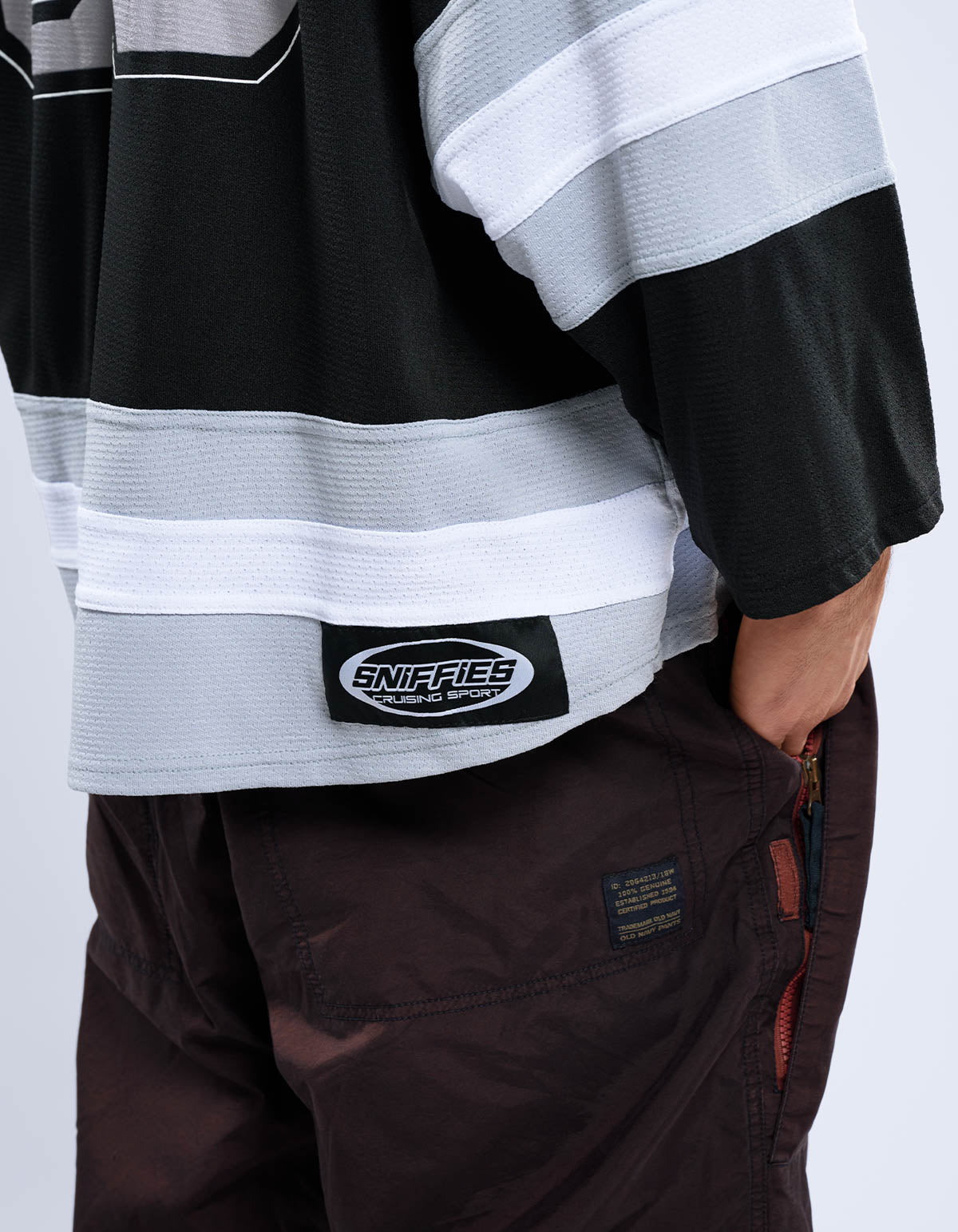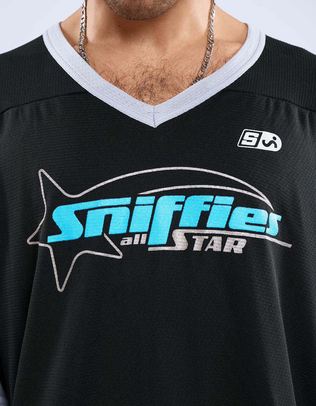The Sniffies All Star Hockey Jersey is built for players who know how to skate, score, and stir up a little trouble. With bold striping, a crisp V-neck, and that signature Sniffies star across the chest, this jersey blends sport fantasy with cruising realness. Lightweight and breathable, it's perfect for layering, sweating in, or wearing with nothing underneath if you're hoping someone asks what team you play for. The sleeve graphics and clean color blocking give it that “locker room hero” energy. Whether you're on the ice, at a party, or prowling after dark, this jersey lets everyone know you're an All Star in more ways than one.