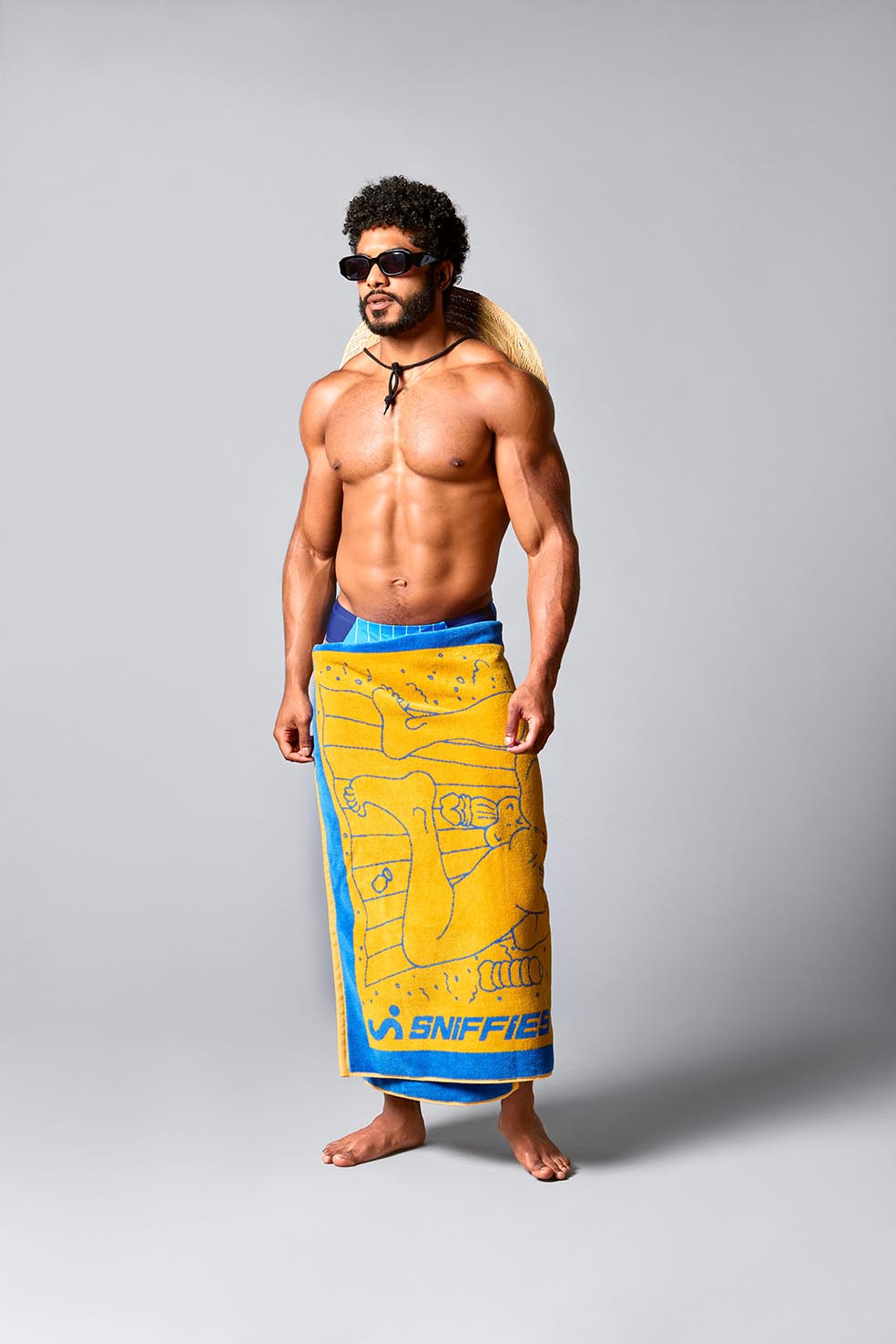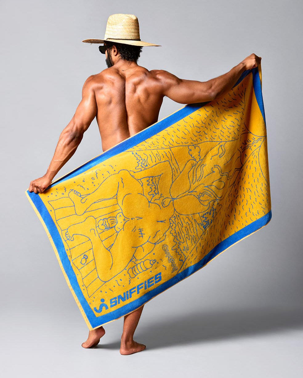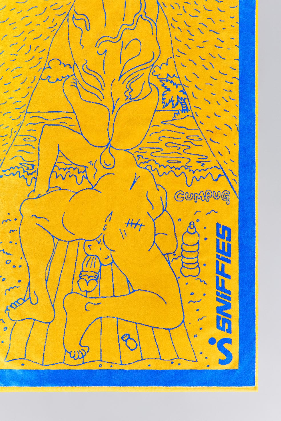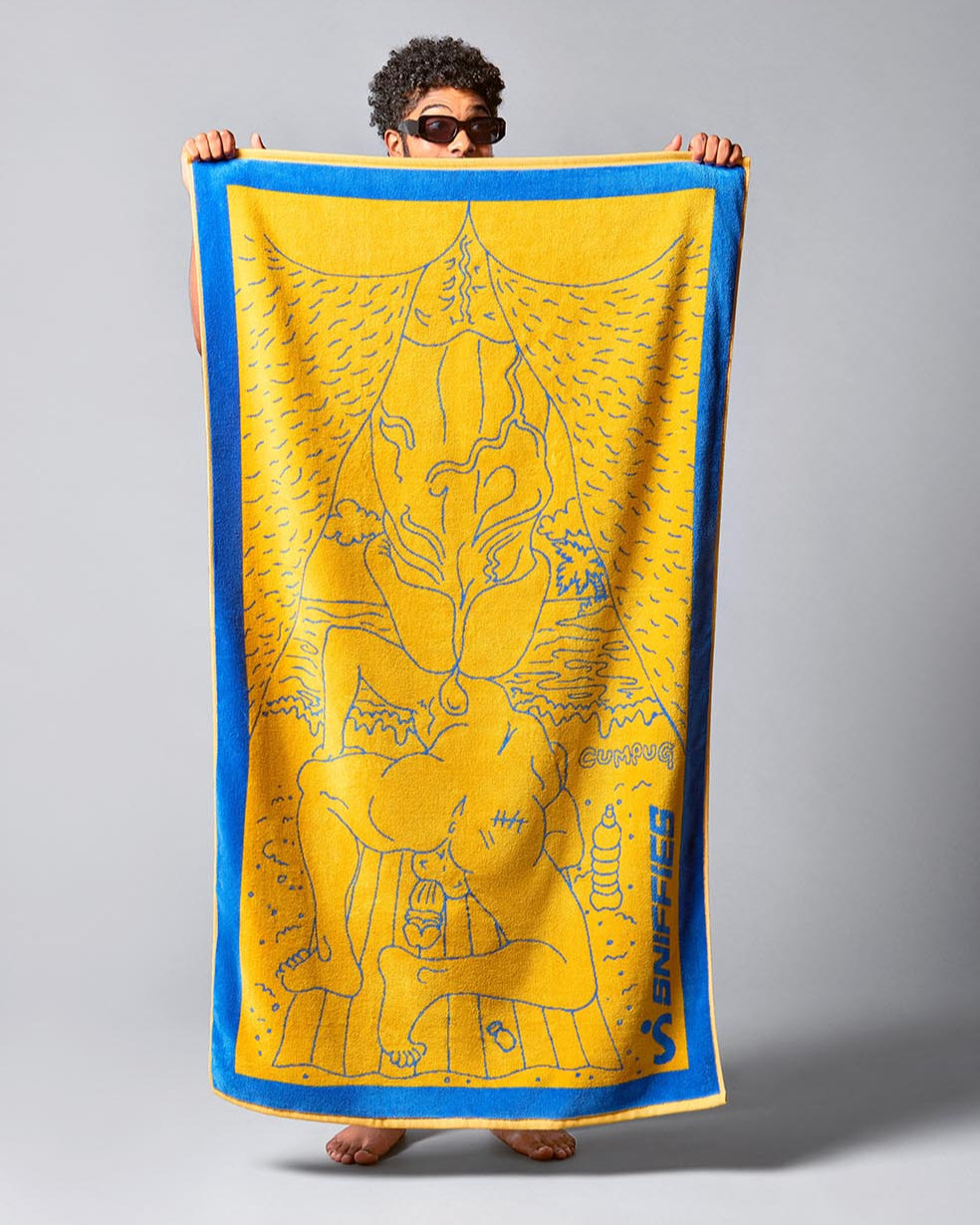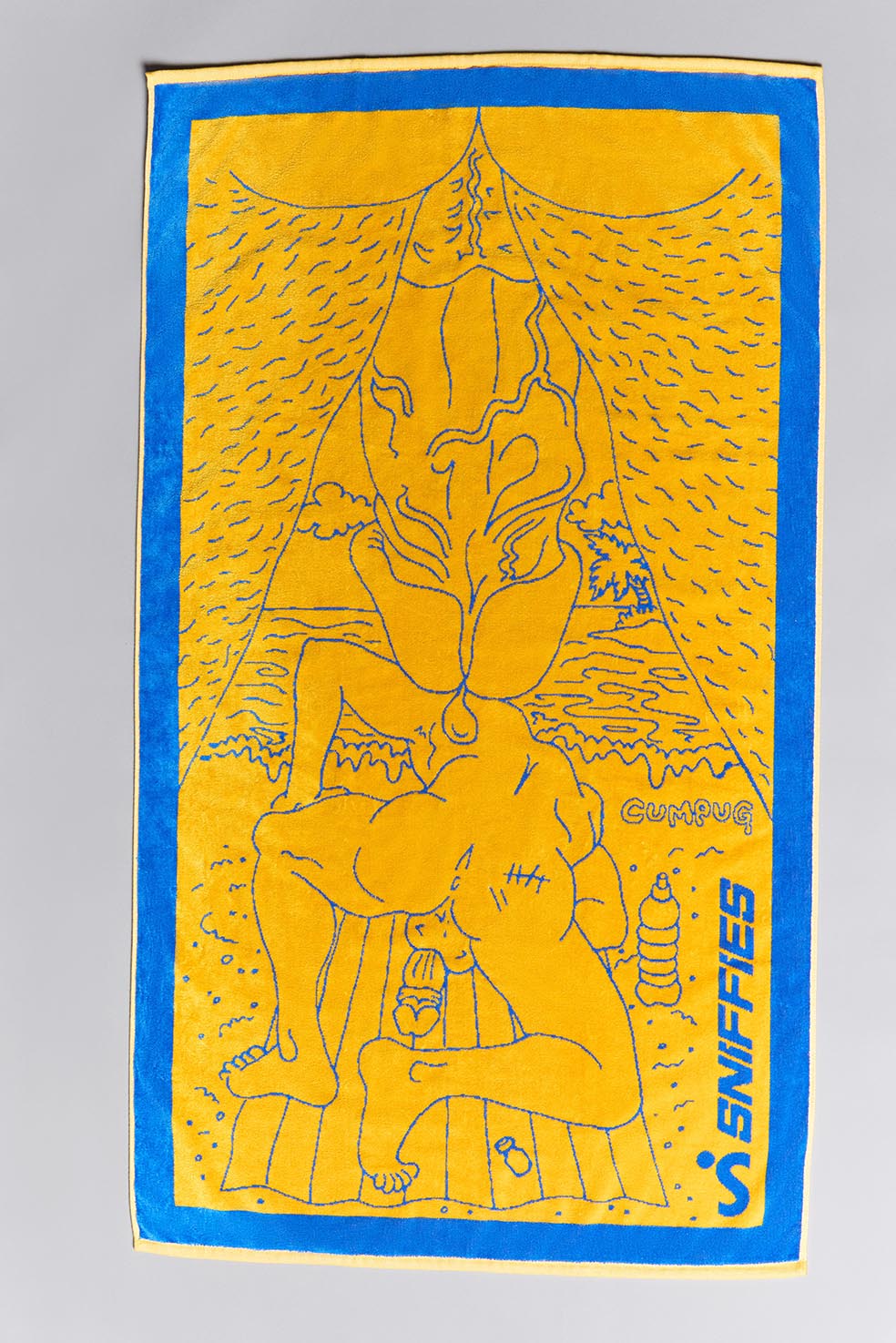The Cumdump Towel was drawn for Sniffies by the legendary Cumpug, whose visual art explores themes of sexual identity and anonymous sex by merging personal experience and fantasy. This velvety beach towel will turn heads at every beach and pool our Cruisers find themselves. We chose a larger towel to ensure there's room for visitors, and chose a shear finish for a controlled fray on the towel for a premium, extra soft finish.