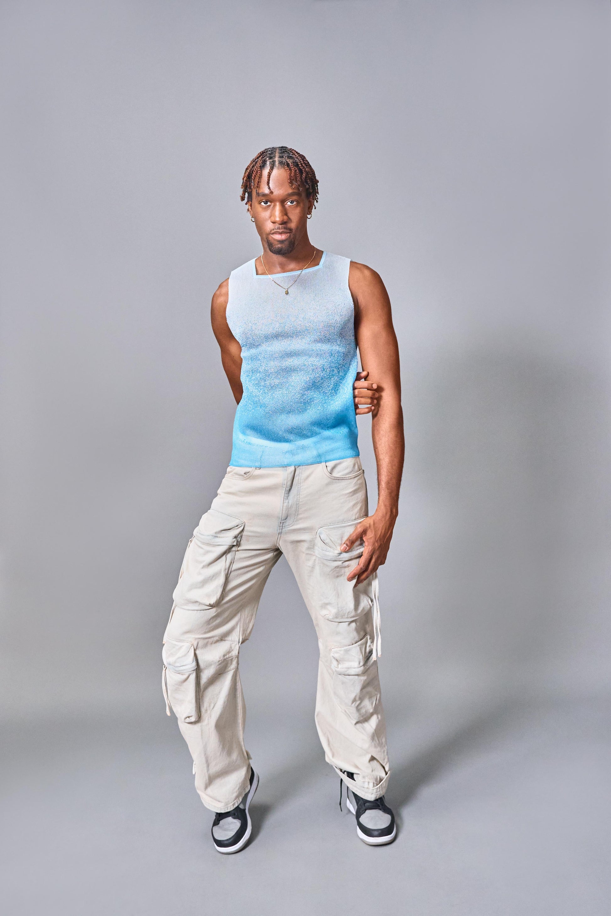 Fang developed this unique birdseye jacquard fabric just for the FANG x Sniffies Gradient Tank. This breathable, sheer, lightweight, two-tone fabric creates a pixelated light blue gradient with a finished neckline for a one-of-a-kind vest. An elegant embroidery of the brands’ logos sits below the armhole for those in the know. If you're between sizes, we recommend sizing up.